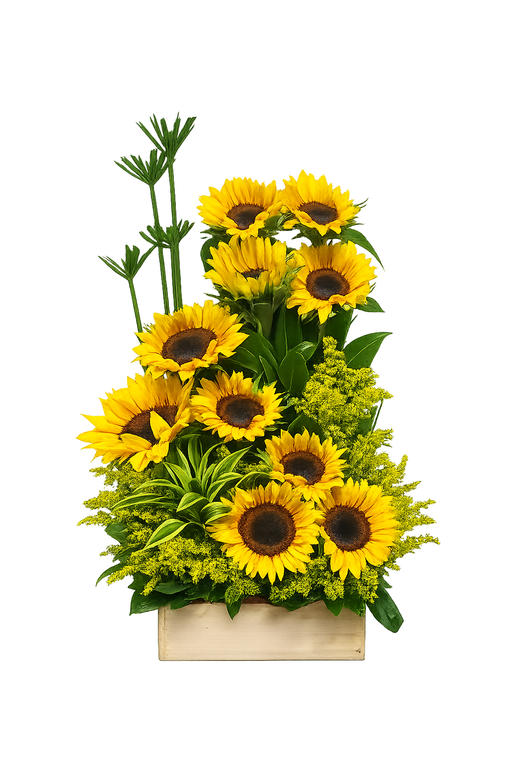 Elegante diseño floral en girasoles acompañado de sombrillitas chinas, canciones de la india y sobrio follaj en base de madera perfecto para regalar a ese hombre especial.