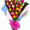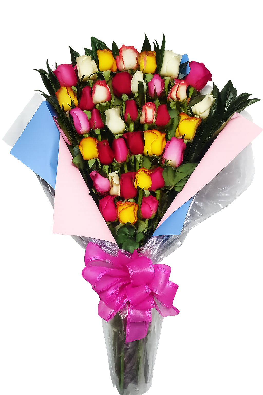 Bouquete con 36  rosas surtidas decorado con papel y moño acompañado con su respectivo mensaje.
