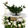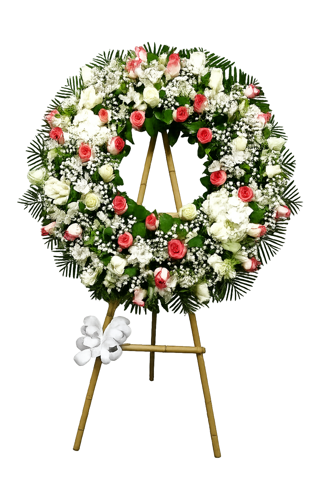 Ofrenda tipo corona, en nuestra linea blanca, en trípode aro blanco.