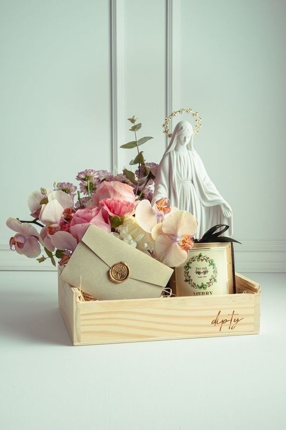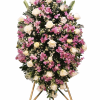 Diseño floral funebre con rosas y orquideas cymbidium acompañado con imagen religuiosa y una vela blanca en una hermosa y elecante caja de madera con su respectivo mensaje.